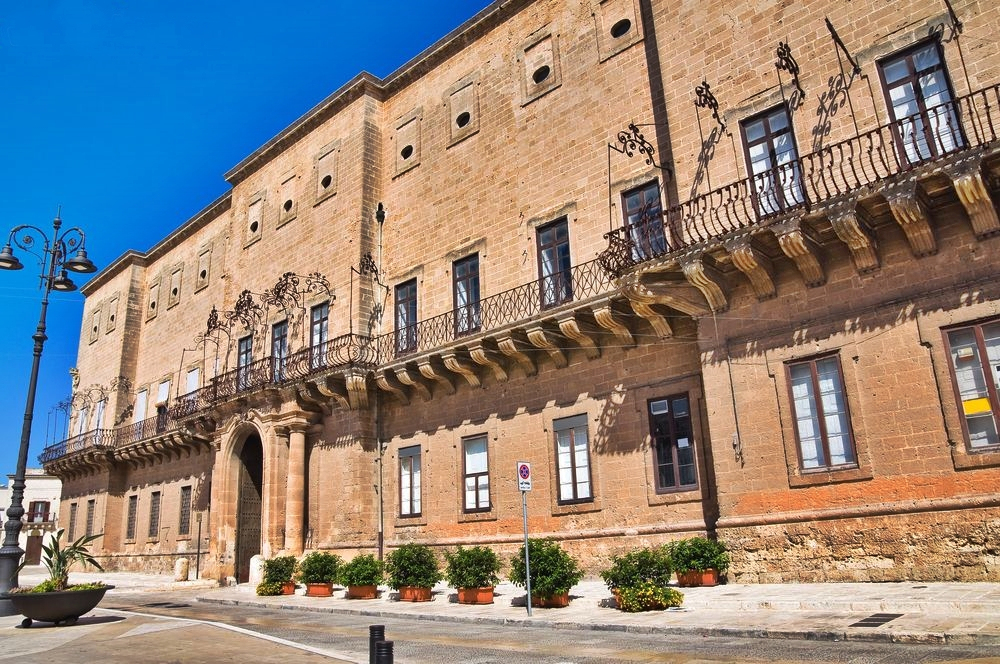 passò al figlio Federico. Nel 1827 fu acquistato dai Filotico. La famiglia Filotico è riportata sul “Librone magno delle famiglie manduriane” dalla metà del ‘500 col capostipite Giulio nel ceto civile. I Filotico nella generazione successiva completarono e arredarono il palazzo, realizzando le decorazioni interne secondo uno stile improntato all’austerità delle sue linee architettoniche. A metà ‘800 vi dimorò la celebre letterata napoletana Virginia Pulli, moglie di Leonardo Filotico, animatrice di un celebre salotto letterario a Napoli. Sempre alla stessa epoca risale la costruzione, sulla facciata nord dell’atrio, dell’ampio loggiato poggiante su arcate, con funzione di collegamento tra lo scalone e l’ala di nord-est. La parte mediana dell’androne al piano terra, che originariamente aveva dimensioni identiche a quelle del soprastante salone d’onore, con due pilastri nel mezzo, fu ridotta in larghezza per creare locali chiusi, sui due lati. L’altissima copertura del salone d’onore, danneggiata secondo alcune fonti già dal terremoto di Terra d’Otranto del 1743, ma di certo ancora presente nel 1804, fu smantellata nella prima metà del secolo XIX, a seguito dei danni causati da una tromba d’aria. Da allora l’ambiente, assai suggestivo, è denominato “salone scoperto”. L’immobile è residenza privata della famiglia Filotico da ormai da due secoli, nove generazioni; i locali esterni del piano terra, destinati ad attività commerciali, in seguito ad una divisione tra eredi nel dopoguerra passarono in parte ad altri proprietari, tra cui Unicredit Banca e la famiglia Schiavoni-Daversa. Sottoposto a vincolo di tutela come “immobile di rilevante interesse storico-artistico” fin dal 1917, e denominato ufficialmente “palazzo Imperiali-Filotico” nel decreto emesso dal ministero dei Beni Culturali ai sensi della L.1089/1939, è iscritto all’ADSI – Associazione Dimore Storiche Italiane – sezione Puglia. Di recente (2015) il portale d’accesso, l’androne e lo scalone monumentale sono stati sottoposti ad un intervento di restauro conservativo.